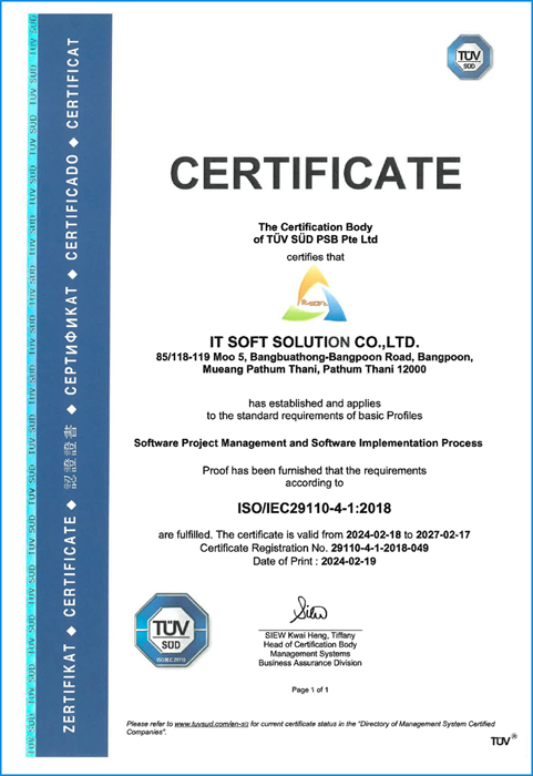 ITSOFT ได้ผ่านการรับรองมาตรฐานสากล ISO/IEC 29110 มาตรฐานด้านการพัฒนาซอฟต์แวร์ ปัจจุบันได้ประกาศเป็นมาตรฐานผลิตภัณฑ์อุตสาหกรรมของไทย หรือ มอก.29110